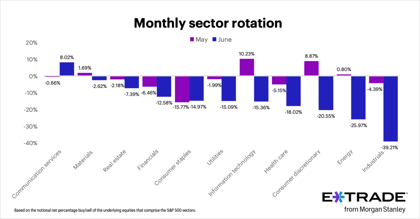 In June, traders continued the early summer’s profit-taking with net selling in 10 out of the 11 sectors, according to Chris Larkin, managing director of trading and investing at E-Trade from Morgan Stanley. Investors are bullish on communication services. However, industrials saw a dip in consideration. “Further, traders rotated out of the energy sector amid volatile oil prices, the outperforming consumer discretionary sector, and health care,” Larkin said in a statement.