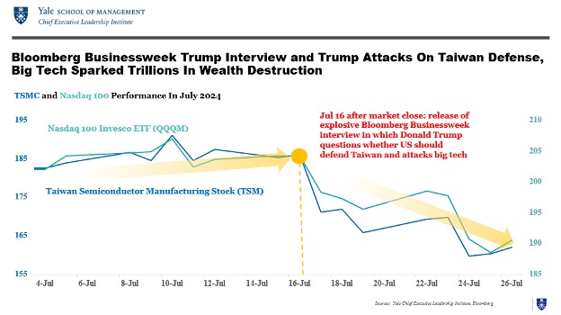 For example, consider what happened after Trump attacked Taiwan’s semiconductor manufacturers, which account for ~90% of the world’s production, and questioned whether the U.S. Should defend Taiwan militarily in an interview with Bloomberg Businessweek. In the immediate aftermath, U.S.-founded Taiwan Semiconductor (TSMC) plummeted ~15%, and the broader semiconductor index plunged 10%. Charts clearly show that July 16—the date on which the Bloomberg Businessweek interview was published—was an unmistakable turning point.
