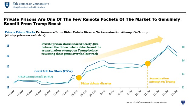 The losses in market value from Trump’s attacks dwarf the few isolated pockets of the market that have benefited significantly from the prospect of a Trump win, in what some have dubbed the “Trump Trade”—sectors that have been heavily regulated under the Biden administration, such as private prisons, predatory lenders, and gun manufacturers. In any case, initial gains in these sectors in the days following Biden’s debate disaster and the assassination attempt on Trump have largely been reversed over the last couple of weeks.