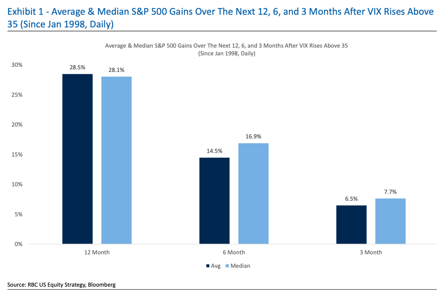 Once above this threshold, RBC noted that the S&P 500 index has historically gained during the subsequent three, six and twelve months a respective 6.5%, 14.5% and 28.5% on average, citing data going back to the start of 1998: