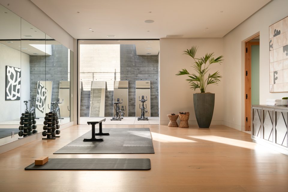If that doesn’t mean much to you, it has a movie theater with leather chairs, an equipped gym and spa, a tennis court, and a pool and accompanying pool house, as well as a lounge with a small bar and pool table. Basically, everything you could want—all naturally gated by stunningly tall trees.