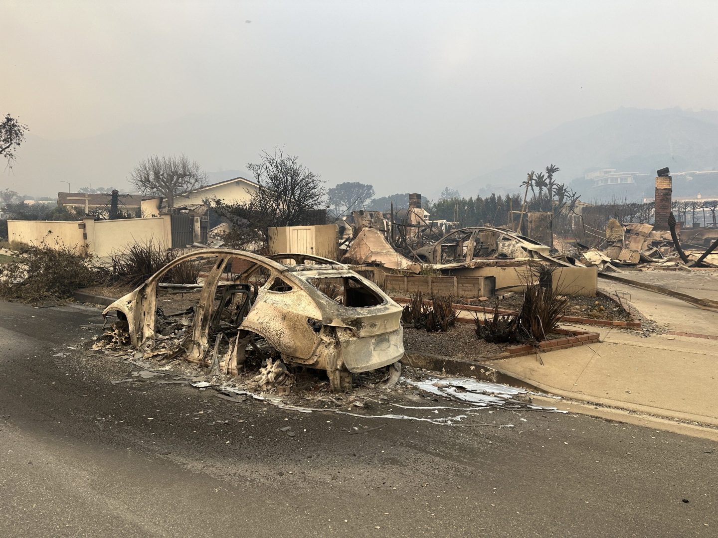 The next day, Wednesday, Parker’s wife and daughter drove to a family member’s home in Palm Springs, while he circumvented street closures and emergency vehicles in order to hike 45 minutes up to his neighborhood, where he found his home, which he and his family have lived in since 2019, in “a fine rubble.” Just 26 hours after he last left, his and most of his neighbors’ homes were completely burned to the ground. He took photos and videos to share in WhatsApp.