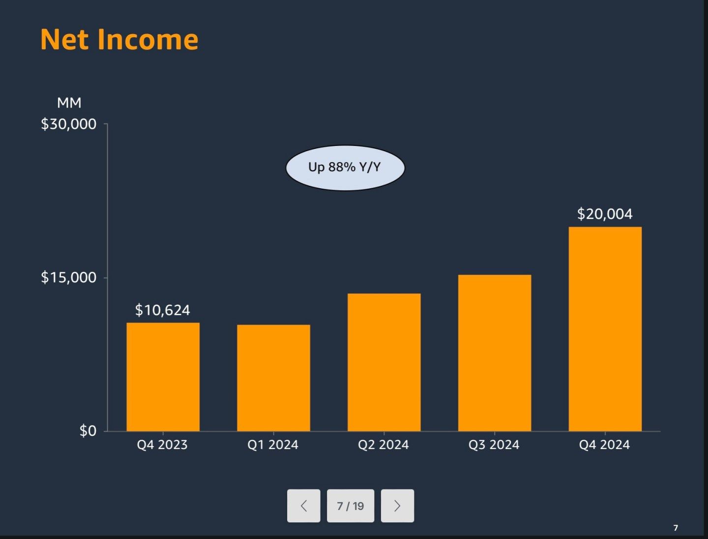 Overall, Amazon’s revenue grew 10% year over year in the fourth quarter to more than $187 billion, in line with analyst expectations, and likely marking the first time the company has surpassed its retail rival Walmart in quarterly sales. (Walmart reports earnings latest this month, but is expected by analysts to generate around $180 billion in quarterly revenue. It’s also worth noting the comparison is not exactly apples to apples, as Amazon’s cloud business generates 15% to %17 of overall revenue without a similar offering from Walmart.) The tech giant’s quarterly net profit of $20 billion, marked a 88% increase over the same quarter in 2023.