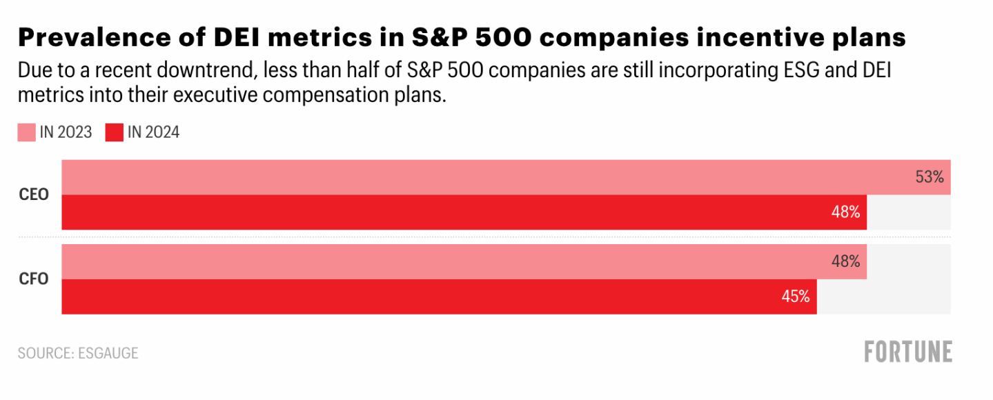 However, mounting legal and political pushback has since caused some to retreat from the practice. ESGAUGE told Coins2Day that many firms are still incorporating DEI metrics into their executive compensation plans, although not as frequently as before. Nearly half of companies still included such incentives for CEOs and CFOs. In 2023, among CFOs at S&P 500 companies, 48% had their compensation linked to ESG and DEI metrics, compared to 45% in 2024, according to the data.