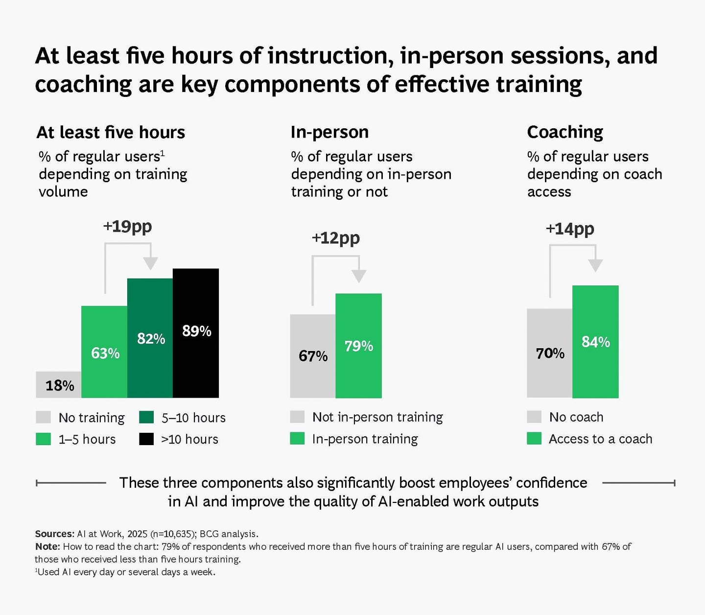 The survey found that only one-third of employees say they’ve been properly trained on AI. BCG says that regular use leaps when employees receive at least five hours of training and have access to in-person training and coaching. Peer-to-peer skills sharing, which is when prolific AI users share tips with their team members that aren’t as adept at using these tools, is also helpful.