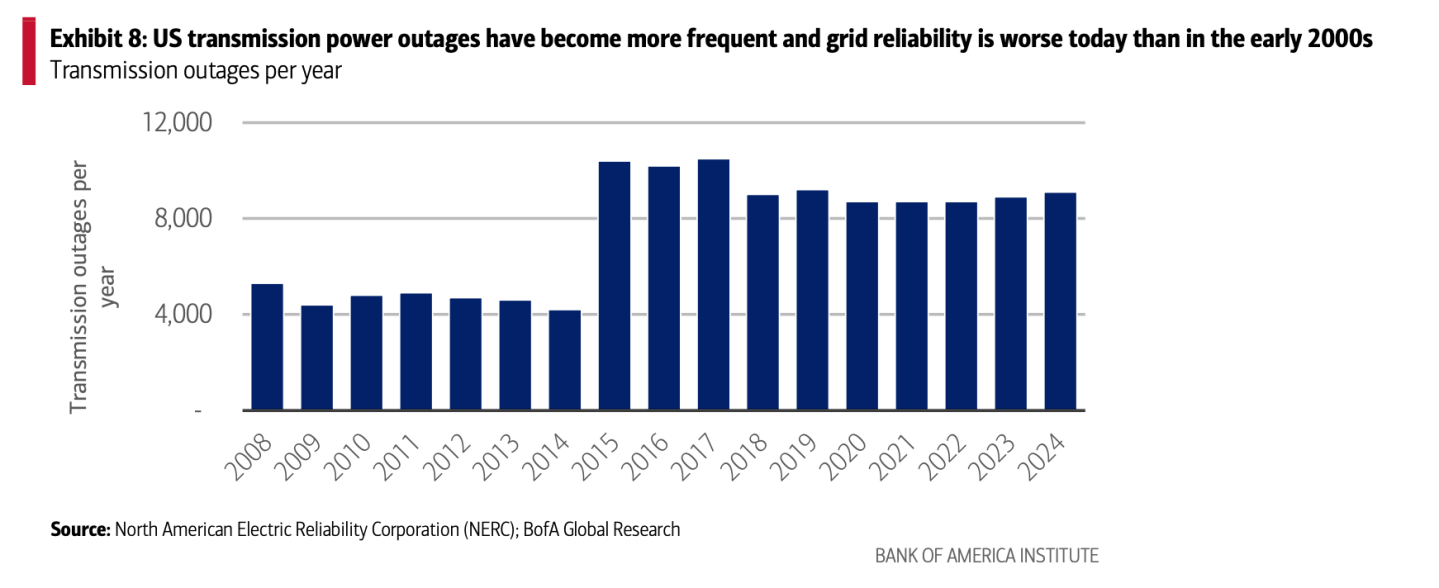 The net result of all these factors? More outages and less reliability. Even as utilities invest almost $100 billion a year in basic infrastructure, BofA’s analysis shows customer satisfaction is likely to hit new lows if the current pace of replacement and expansion isn’t accelerated. Transmission outages have become more frequent, and the resiliency of the grid—especially against weather events or cyberattacks—is declining.