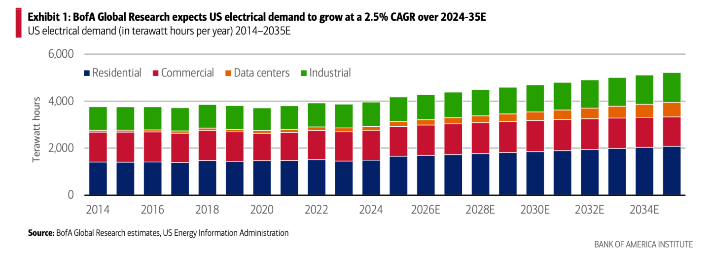 Why is demand rising so sharply? The BofA report identifies four main forces pushing load growth into uncharted territory, projecting that overall U.S. Electrical demand will grow at a 2.5% compound annual rate through 2035, far outpacing the 0.5% annual growth seen in the previous decade.