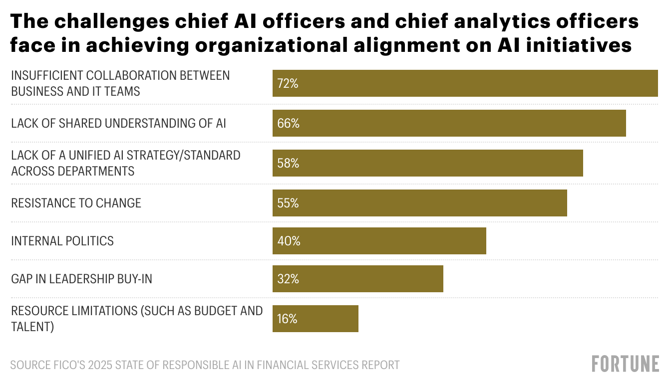 In addition, 72% of chief AI officers and chief analytics officers cite insufficient collaboration between business and IT as a major barrier to company alignment. Departments often work from different metrics, assumptions, and roadmaps.