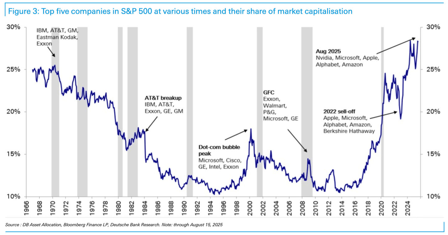 Stock valuations overall have soared alongside the “Magnificent Seven” tech firms, which collectively comprise a third of the S&P 500’s market cap. (The most magnificent: Nvidia, now the world’s most valuable company at a market cap exceeding $4 trillion.) Yet Deutsche Bank points out that today’s top tech players have healthier balance sheets and more resilient business models than the high flyers of the dotcom era.