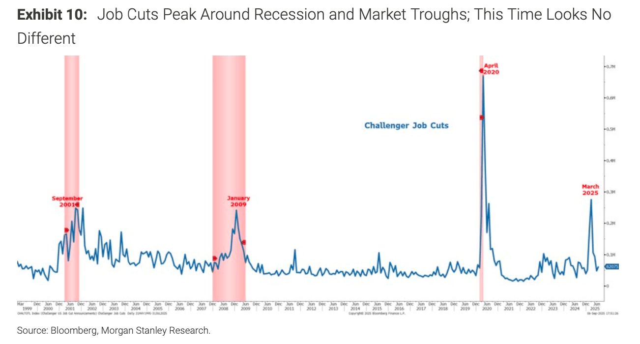 Morgan Stanley points to April 2025, when the White House announced new tariffs in a move dubbed “Liberation Day,” as the recession’s trough. Around this inflection point, leading indicators like earnings revisions breadth—a proxy for corporate guidance—showed dramatic, “v-shaped” rebounds for the first time since early pandemic recovery. Payroll revisions and job cut data also corroborated the bottom, peaking last spring and declining since.