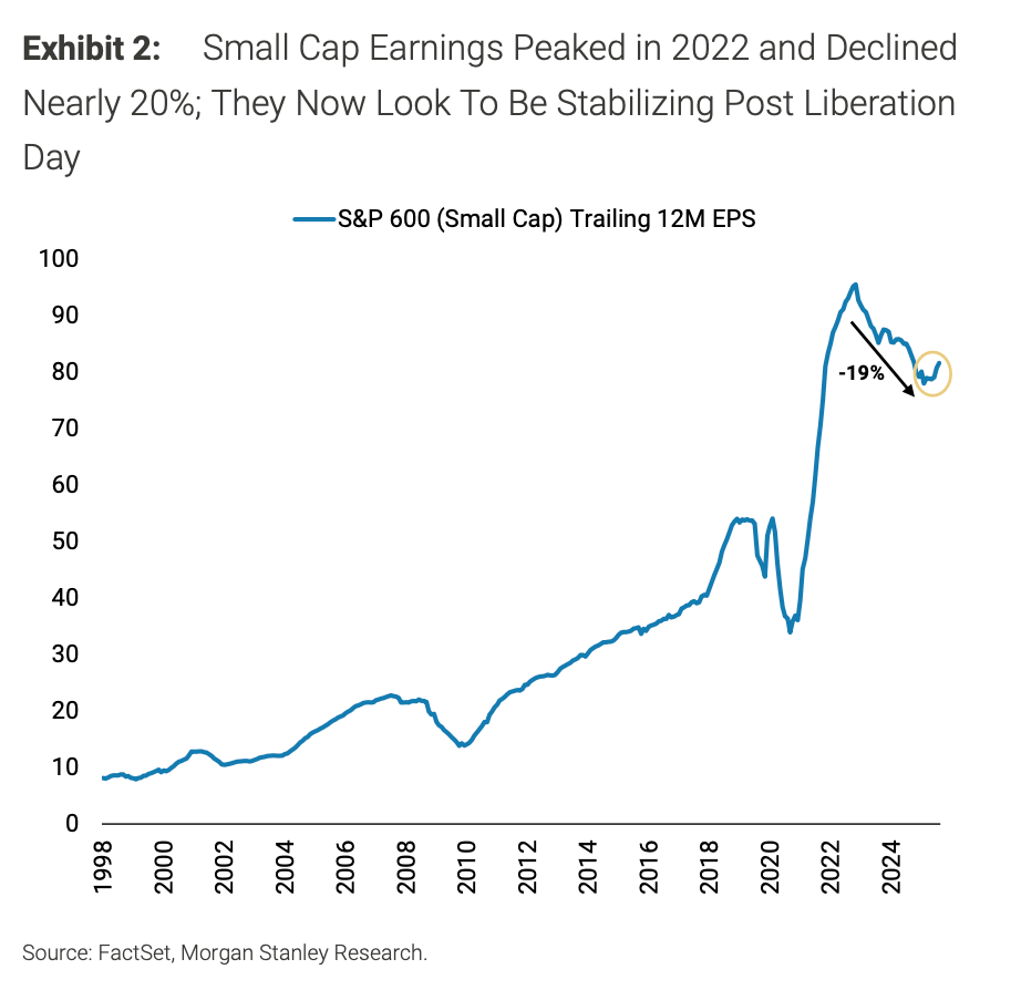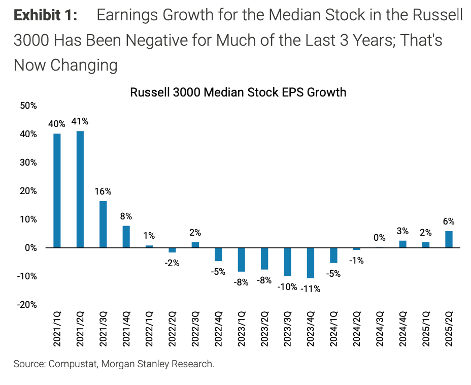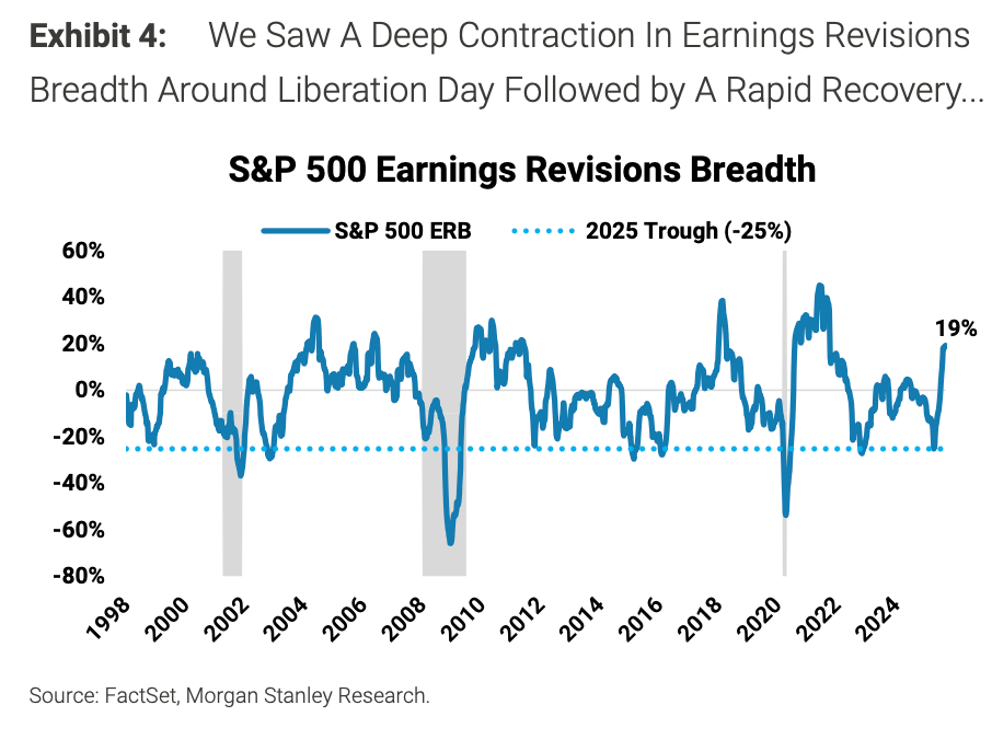 Wilson argues that looking at earnings growth as well as consumer and corporate confidence surveys is a “better way to measure the health of the economy.” By those metrics, earnings growth has been negative for most companies over the past roughly three years, Wilson argues, and the V-shaped rebound in earnings revisions upward shows that corporate confidence “has improved materially since Liberation Day.”