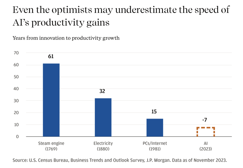 After the steam engine was introduced, 61 years passed until productivity rose. That interval shrank to 32 years with electricity and 15 years with computers and the internet. For AI, JPMorgan estimates it will be less than seven years.