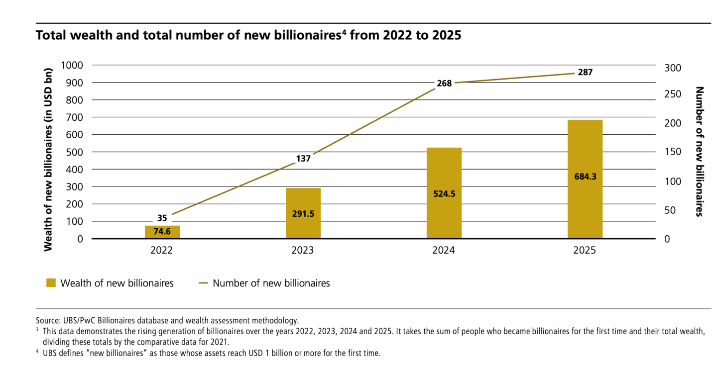 That year, 360 self-made billionaires represented $782 billion, a “exceptional rise [that] resulted from asset price appreciation in a period of ample financial liquidity following the Covid-19 pandemic.” The outcome in 2025 was more attributable to “widespread business creation,”, according to UBS. The study revealed that the annual count of newly created billionaires surged approximately eight times, from 35 in 202 to 287 in 2025, with their wealth expanding by about 9x, moving from $74.6 billion to $684.3 billion.