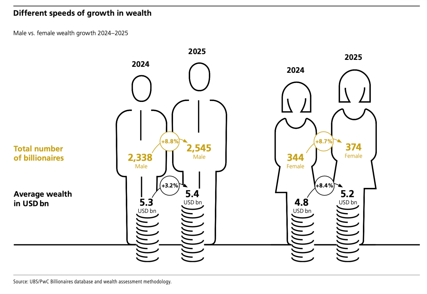 According to the report, women who are billionaires experienced significant advancements in 2025. Although there are a total of 374 female billionaires worldwide, contrasting with 2,545 male billionaires, their median wealth increased by 8.4% to $5.2 billion during 2025, which is more than double the 3.2% median growth rate observed for men. This reflects an ongoing pattern, as the median wealth of female billionaires has been escalating at a quicker pace for each of the four years since 2022. A contributing factor to this is inheritance, with a greater number of women acquiring billionaire status through inheritance than through any other method in 2025. UBS's findings indicated that out of the 43 women who achieved billionaire status that year, 27 inherited their wealth while 16 built their fortunes independently.