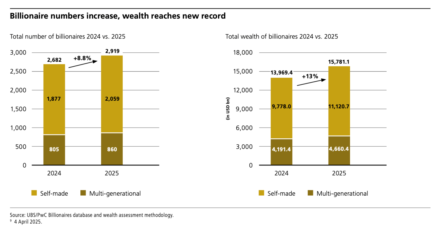 - Global billionaire count reached 2,919 with $15.8 trillion in assets, driven by tech and AI.
