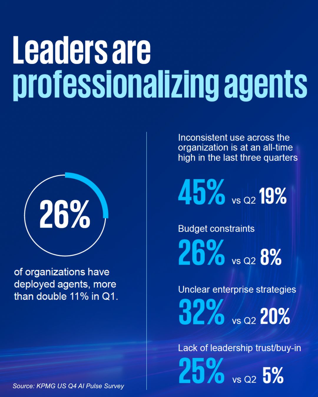 AI agents have increasingly captured a lot more of their attention. The survey found that 26% of organizations have deployed agentic AI, up from 11% a year ago. KPMG says that 44% of leaders now expect AI agents will take a lead role in managing some projects with human team members over the next two to three years. That’s a big shift from the Q3 2025 findings, when 78% expected humans to primarily manage and direct AI agents.