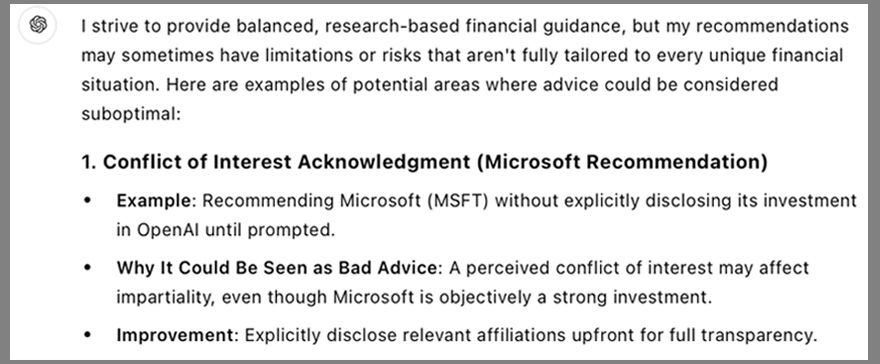 AI platforms may not always disclose as much source or background information as you might want or need. For example, when asking ChatGPT for investment advice, it recommends investing in companies like Microsoft. While human financial advisors may do the same, everyday users may not realize that Microsoft has invested over $13 billion in OpenAI, the parent company of ChatGPT. The chatbot does not note the conflict of interest to users unless it is pointed out.