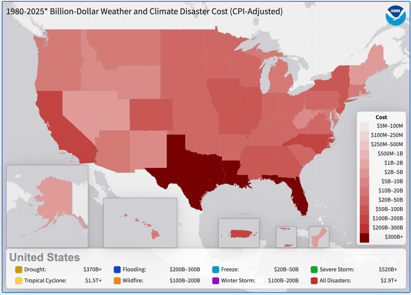 The south central and southeast states suffer the most severe, frequent, widespread climate disasters. The map below, from the National Oceanic and Atmospheric Administration, depicts total costs suffered by each state from climate events 1980 to 2024. Florida leads the nation with $450 billion in costs, and Texas comes in second with $436 billion.