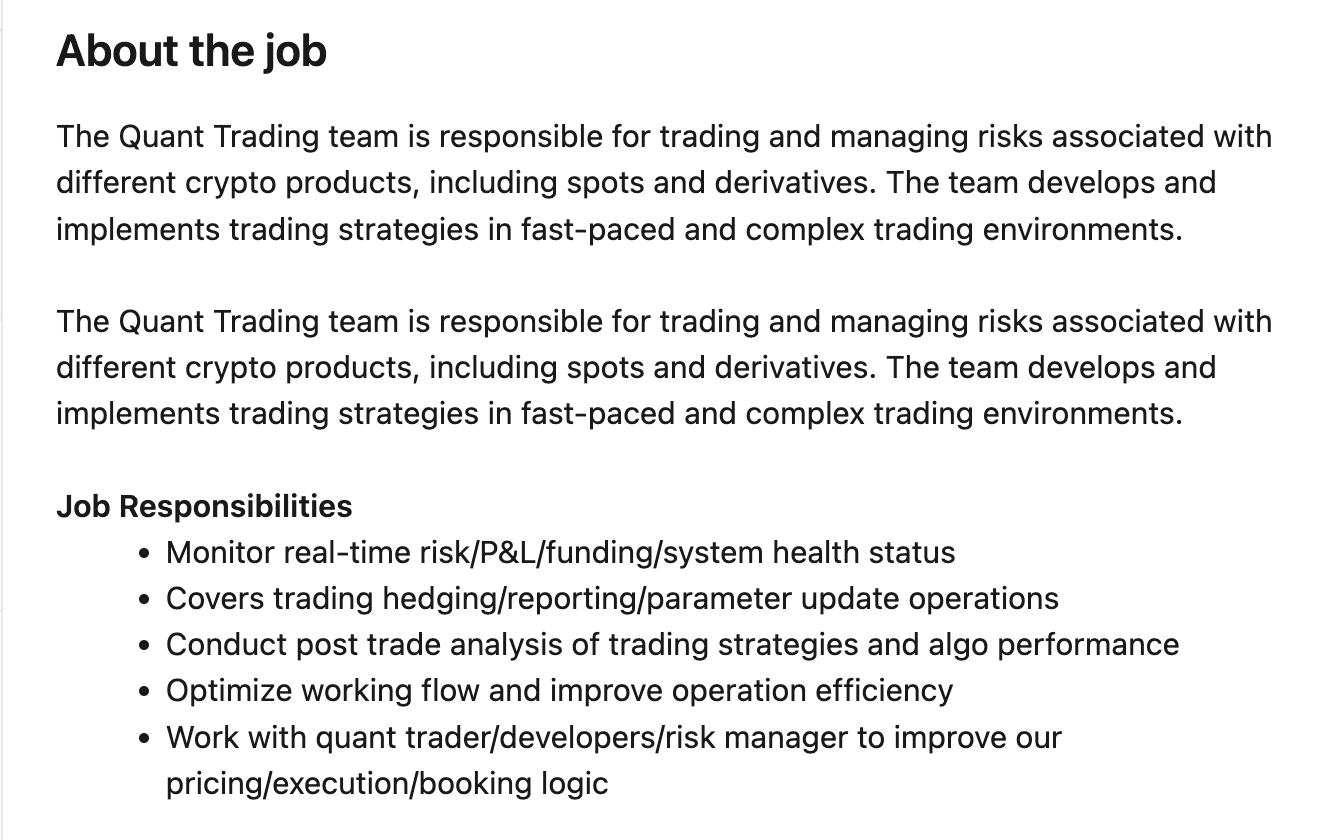 According to McCarthy, the research analyst, it’s possible that wash trading contributed to Crypto.com’s recent surge in volume, but he says other explanations are more likely. He posited that some of the volume came from the exchange having a prop desk, or in-house trading team. McCarthy pointed to recent job ads describing such a team, one of which Coins2Day independently located on LinkedIn. As seen in the screenshot below, it describes developing and implementing trading strategies: