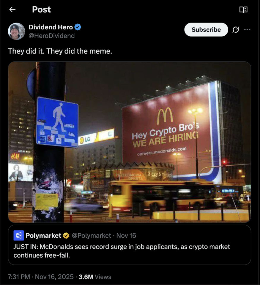 The timeline is suddenly full of McDonald’s memes—a mainstay of bear markets as crypto bros joke about being so ruined they have to sling fries.